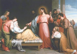 Vừa ra khỏi hội đường Caphácnaum, Đức Giêsu đi đến nhà hai ông Simon và Anrê. Có ông Giacôbê và ông Gioan cùng đi theo. Lúc đó, bà mẹ vợ ông Simon đang lên cơn sốt, nằm trên giường. Lập tức họ nói cho Người biết tình trạng của bà. Người lại gần, cầm lấy tay bà mà đỡ dậy; cơn sốt dứt ngay và bà phục vụ các ngài.